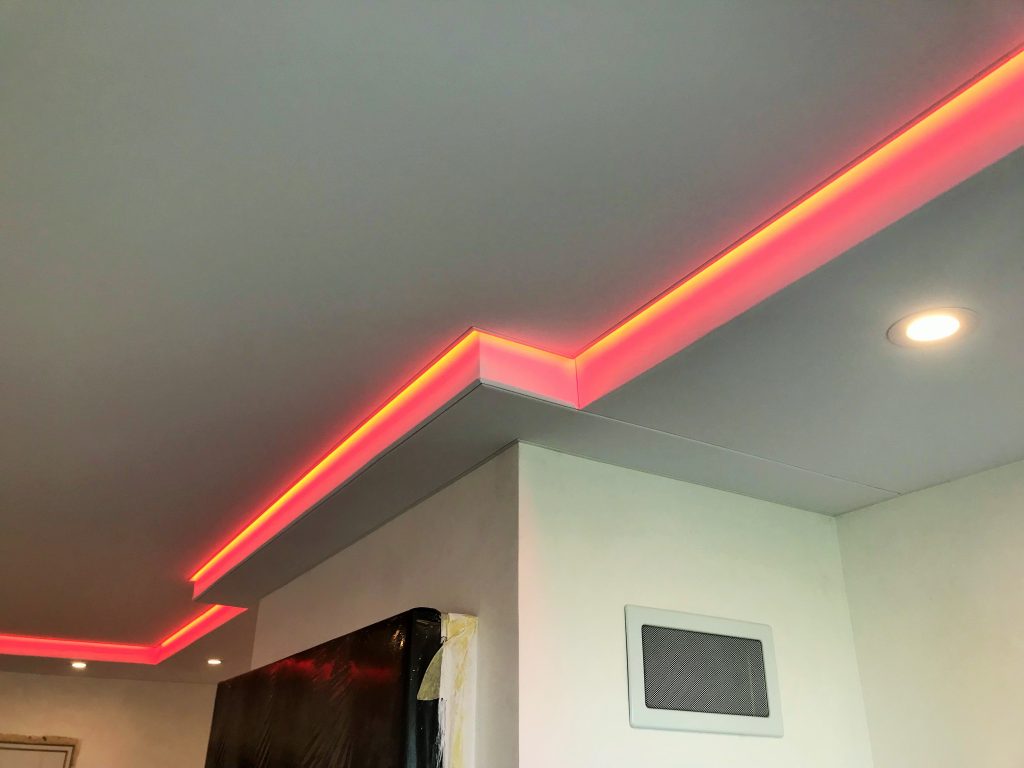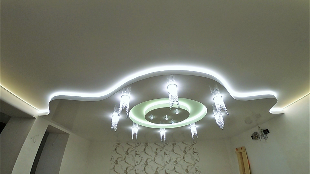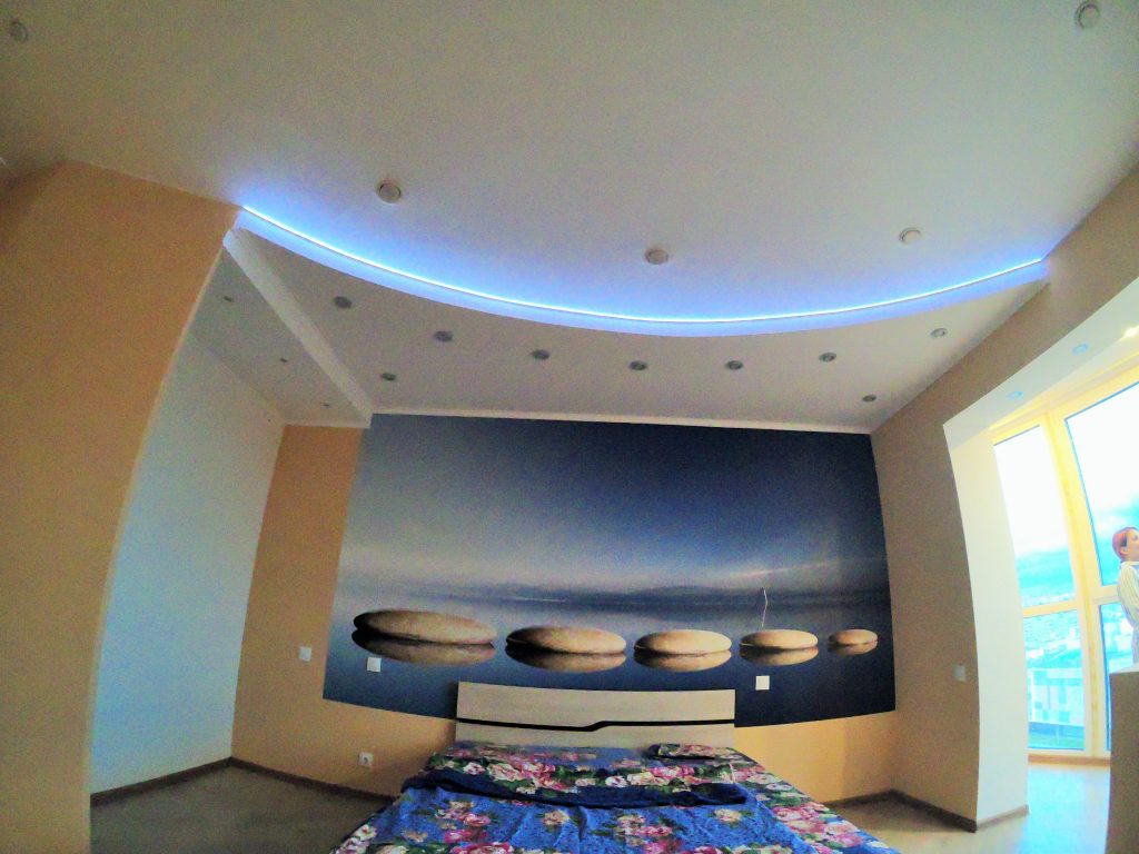 Третий инструмент прекрасно сочетается с концепцией двухуровневых потолков. Ведь внутри конструкции можно спрятать все ненужные элементы. В том числе и светодиодные детали. В таком случае потолок словно светится изнутри и подчеркивают форму пространства.