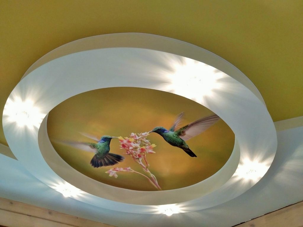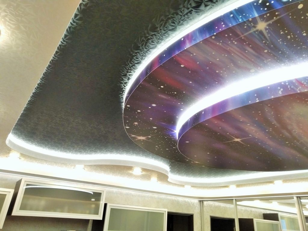 Звездное небо служит практически волшебным вариантом для оформления. Многие любят смотреть на небо: причем как ночное, так и дневное. Главное, чтобы подобное полотно не раздражало и не создавало лишнее напряжении. Вариант красивый, но психика людей индивидуальна. Поэтому дизайнеру стоит дополнительно поинтересоваться, для кого делается оформление комнаты.