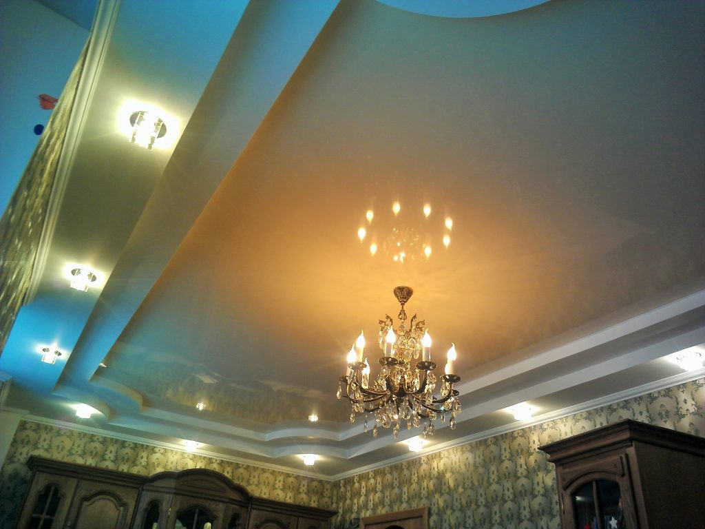 Не нужно забывать, что территория состоит не только из потолка. Поэтому будет лучше,если все части сочетать друг с другом. Можно встроить полотно под цвет мебели,а светильники подружить со стенами и полом.