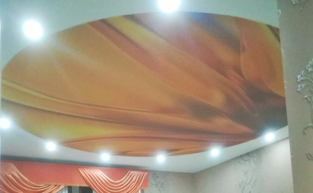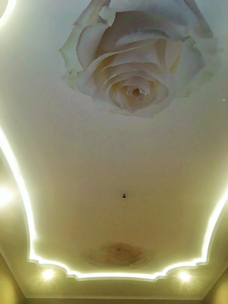 Потолок в спальне должен способствовать быстрому снятию напряжения и скорому засыпанию. Обычно в этой комнате проводят не очень много времени, поэтому принт полотна необязательно должен быть запоминающимся. Достаточно, чтобы он был оформлен со вкусом.